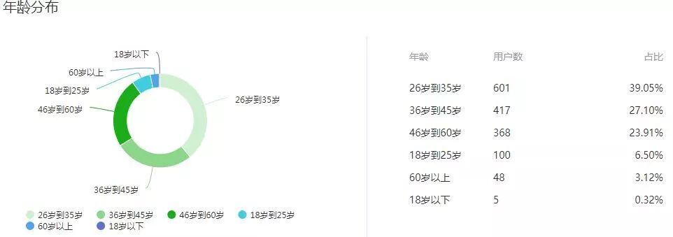 其次就是年龄构成。根据后台的统计,39%的用户在26到35岁之间,27%在36到45岁之间,还有24%在46到60之间。