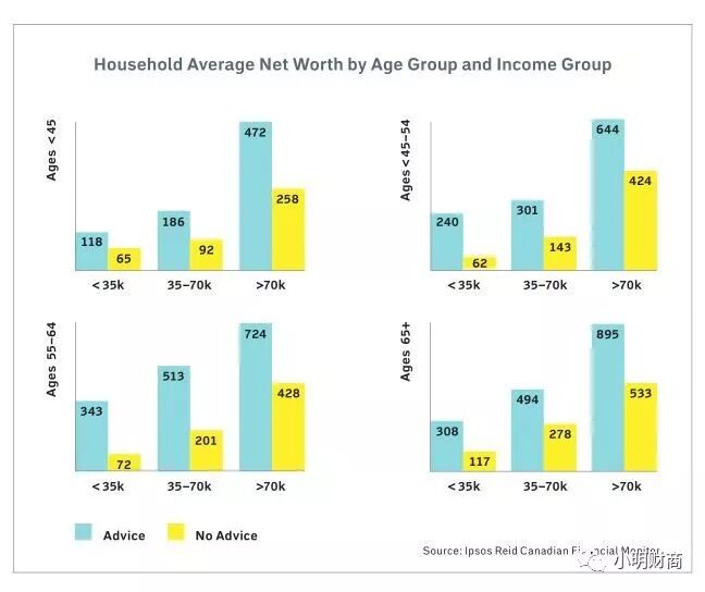 除了加拿大,在美国和澳大利亚做的类似研究也有相同的结论。这些研究表明理财建议有助于每个人达成长期的理财目标。这是不同收入组和年龄组的对比。